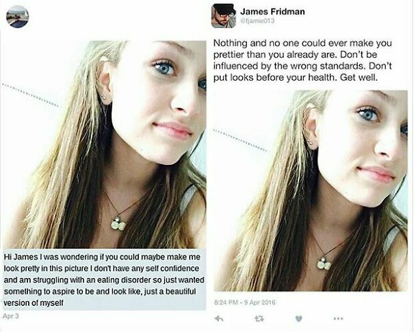 Load More Replies...My favorite photos from James are the ones where someone asks him "can you please remove the scar/fat/brace... and make me beautiful for once in my life" and James tells them they are beautiful just as they are. Good man, James.