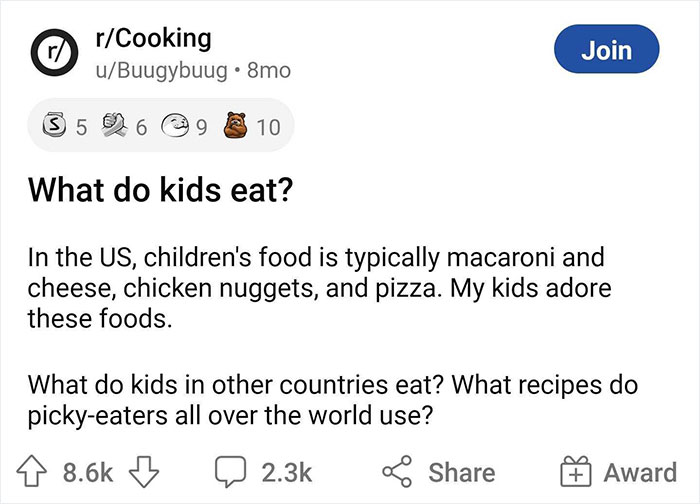 Load More Replies...So many people are not understanding this question. The responses are missing the point. It is not a question of "what food do YOU like" or "what did YOU like as a kid". This is a question about fussy eaters in different cultures.... and maybe 10% of the responses actually get that.