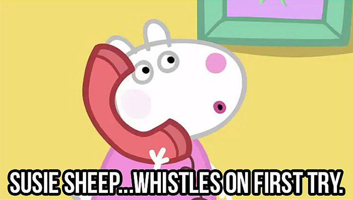 During the skit, the cartoon character called Peppa calls her friend Susie, seeking support because she can't whistle. Susie, however, doesn't know what whistling is. After Peppa explains it, Susie quickly decides to give it a go and wouldn't you know it, and she nails it during her first try. Bummed out, the popular character simply hangs up in response without saying a word.