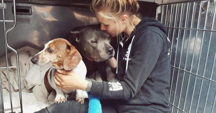 The 12-year-old dachshund, named OJ, and the 6-year-old pit bull Blue Dozer have been best friends since the day they met. They share an extraordinary animal friendship – not only they were adopted as a pair, but also Blue Dozer is OJ’s guide because the poor dachshund is completely blind. The woman who first introduced them to each other adopted the pit bull about four years ago and already had OJ. Sadly, she recently became homeless and couldn’t keep her family pets anymore, but requested that they’d stay together after bringing them to the shelter. And they did. But not for long…