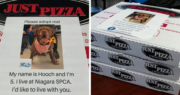 Animal rescue organizations often have to get creative to help cats and dogs find their forever homes. One of the most effective ways is to team up with local businesses. That’s exactly what Niagara SPCA did and achieved some amazing results. The no-kill shelter located in Niagara Falls, New York recently went viral after they teamed up with the Just Pizza & Wing Co. franchise in Amherst in an attempt to help dogs get adopted. The idea they came up with together is absolutely brilliant. They decided to put flyers on pizza boxes, which feature photos of dogs that are looking for new owners.