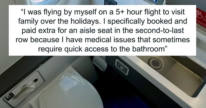 The plane passenger explained that he was on a 5+ hour flight to visit his family over the holiday. The man specifically booked and paid extra for an aisle seat in the second-to-last row because he has medical issues that sometimes require quick access to the bathroom.