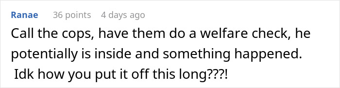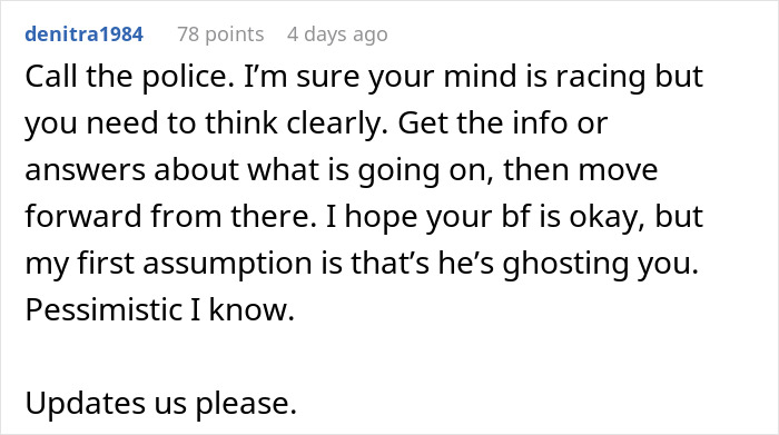 Comment warning about boyfriend’s disappearance, urging to call cops and request a wellness check for safety concerns.