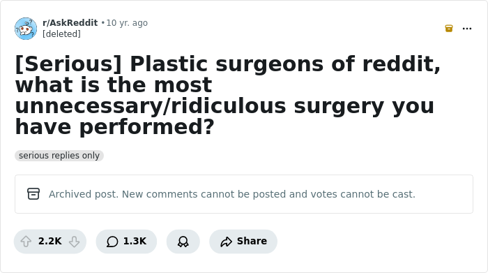 Load More Replies...While plastic surgery has its place for restoration, I think the plastic surgery doctors have completely failed to separate their drive for money from the well being of their patients.