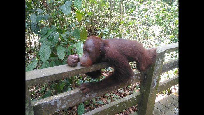 Playful Orangutan Poses For The Cameras at Sepilok Orangutan Rehabilitation Centre in the Malaysian Sabah District of North Borneo. The centre opened in 1964 as the first official orangutan rehabilitation project for rescued orphaned baby orangutans from logging sites, plantations, illegal hunting or kept as pets. The orphaned orangutans are trained to survive again in the wild and are released as soon as they are ready. Today around 60 to 80 orangutans are living free in the reserve. So, welcome to watch how Playful Orangutan Poses For The Cameras.