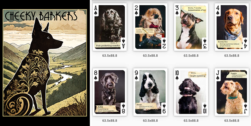 52 dogs were needed for The Cheeky Barkers project. Peaky Blinders-inspired mugshots and old-style portraits of dogs were made into a unique deck of playing cards.