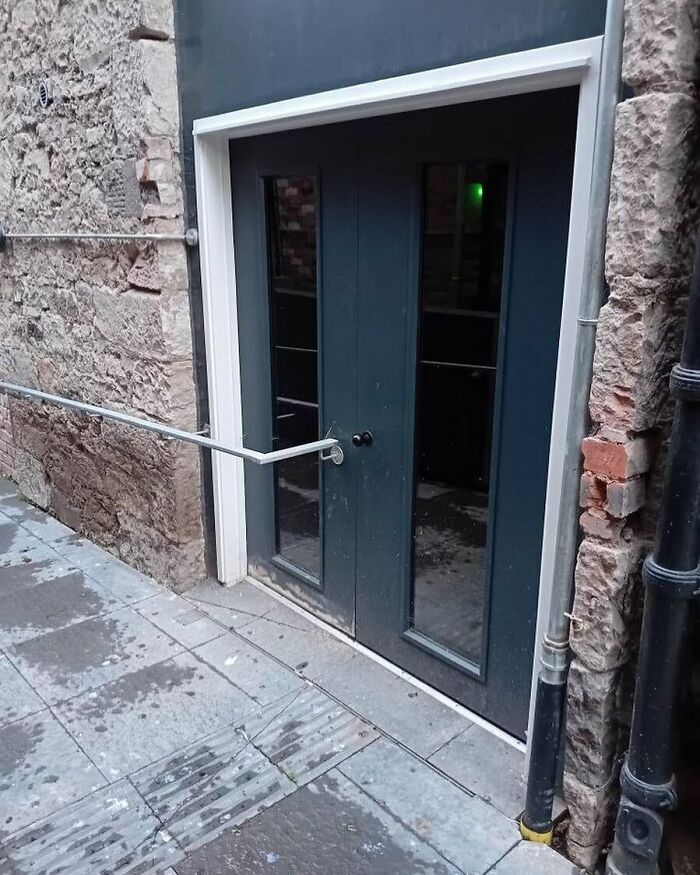 Let me guess. There used to be a large glass window next to the door, and a smaller one above it, but they both got smashed and the building owner is too cheap to replace them, so the whole entryway is no longer secure, but wide open to anyone, including people who don’t live there. Real swell for the occupants. /s