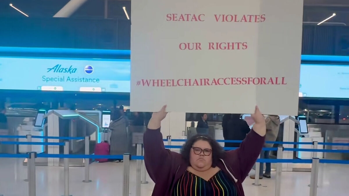 Standing in the middle of the airport, Chaney held up a sign that read, “SeaTac violates our rights. #WheelchairAccessForAll.”