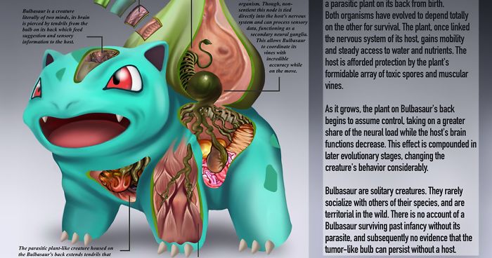 “Drawing them is not the difficult part, the challenge for me is conceptual,” Stoll told Bored Panda. “I spend a lot of my time with the project trying to create fictional anatomy that is both interesting and plausible. A lot of Pokénatomy is based on the behavior and biology of real-world organisms. So for the sake of the project, I’ve found myself thumbing through books on botany, herpetology, metaphysics, and even embryology.”