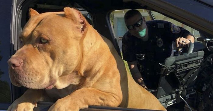 When officer Travis Frost arrived at the call location, he saw a tan-colored large American Bully dog chilling on someone’s porch. Even though this pooch looked intimidating to the caller, the responding officer immediately realized that the animal in question was just a big lap dog. As a precaution, Frost left his car door open before approaching, in case he needed to jump back in real fast. The officer whistled to the presumably dangerous dog, and he happily ran to the policeman, wagging his tail. It turns out, and the dog wasn’t vicious at all. Frost patted the dog and snapped some photos when the good boy jumped into his patrol car. “He went right up to the patrol unit, jumped in the front seat and just made himself at home,” he said. The officer called an animal shelter who helped to find the dogs owner. This furry buddy was back at home within 24 hours.