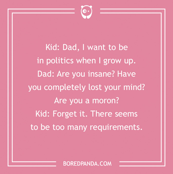 Now, the question here is why we need funny political jokes. Well, we’re no political scientists, but from what our team has gathered, we, the humans of the Earth, tend to make jokes about any Big Thing that takes considerable space in our lives. We do so (willingly or not) just to make it feel more relatable. Based on this, our need to taunt politicians is a way to make them seem less pompous and closer to our reality.