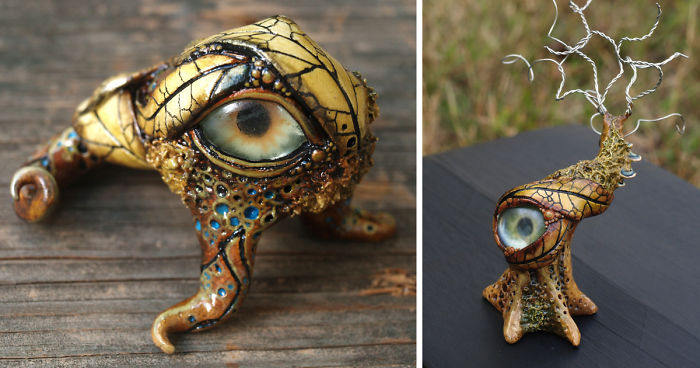 Each sculpture is made primarily with polymer clay, combined with other materials including wire, glass, moss and modeling paste. They are each painted by hand and sealed with satin glaze.