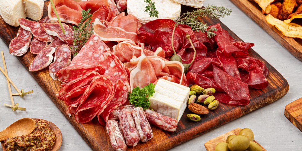 ""charcuterie is a French term for a branch of cooking devoted to prepared meat products, such as bacon, ham, sausage, terrines, galantines, ballotines, pâtés, and confit, primarily from pork." NOT ONE PIECE OF MEAT IN THIS PICTURE ! lol