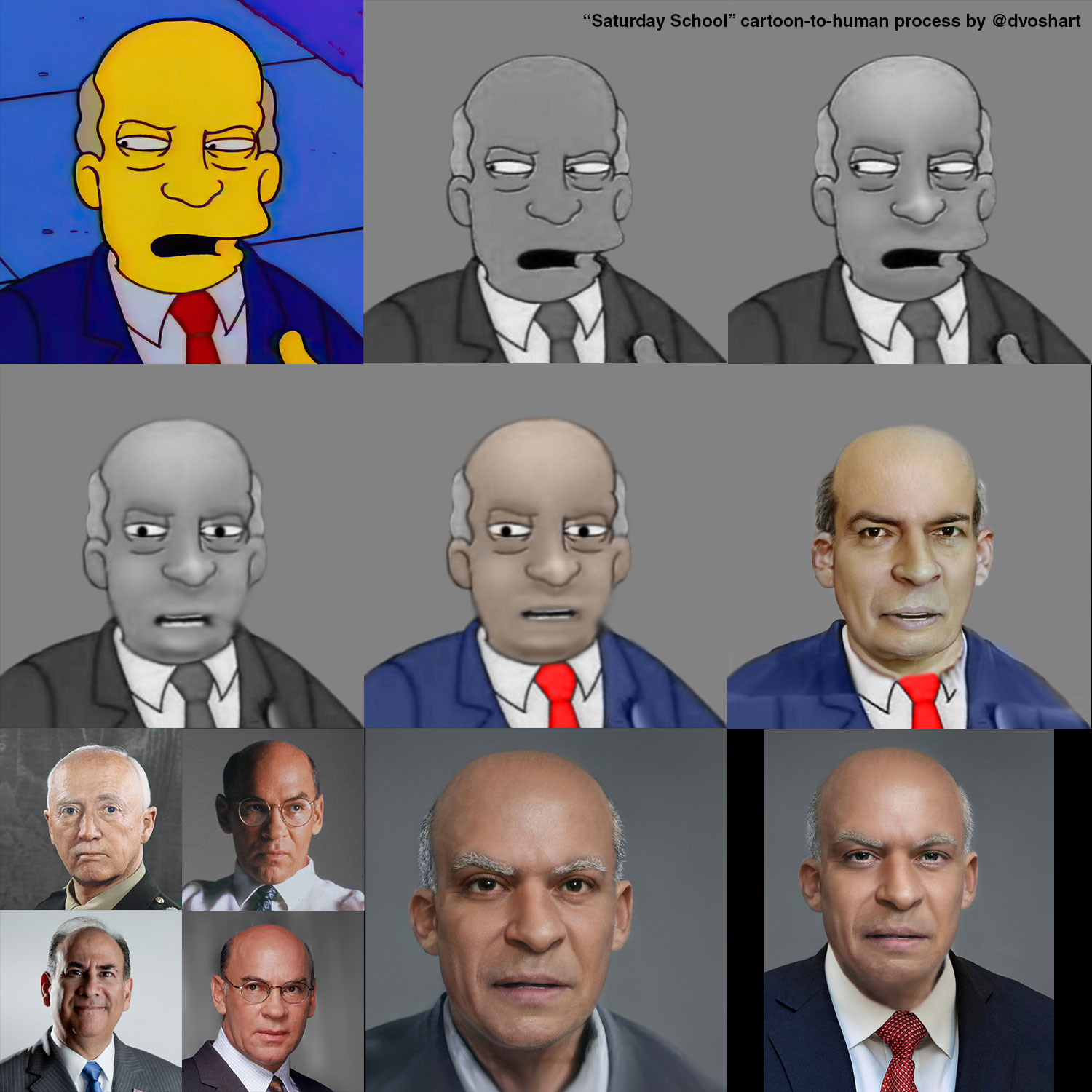 Artbreeder is a tool that allows you to make modifications to portraits (gender, age, ethnicity, etc.). If it recognizes the face, you can then make changes (the technical term is move through latent space). One needs to first prepare the flat cartoon to be realistic enough to be recognized by the software. Attached is a GIF process of how I made Superintendent Chalmers from the Simpsons. He didn't make the cut, though!