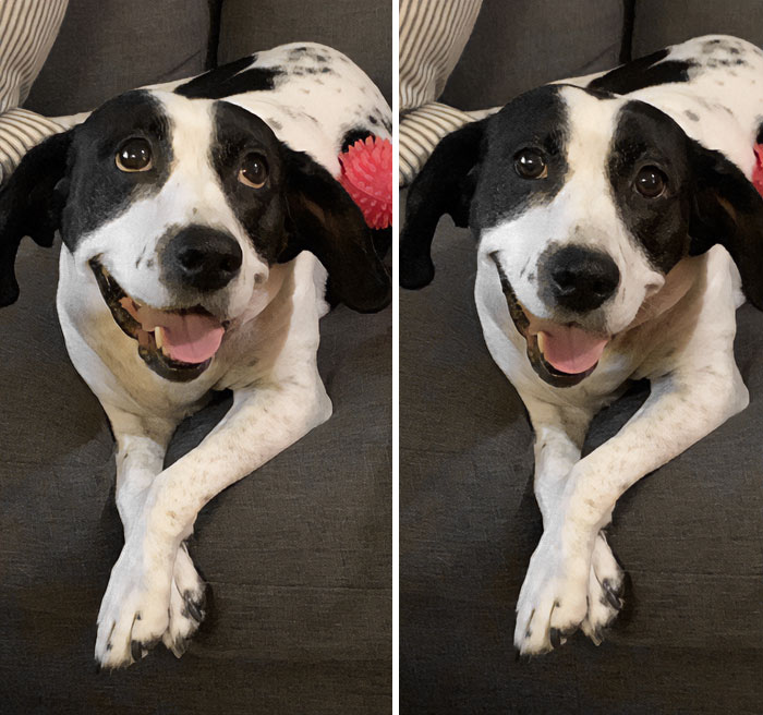 14 year old, mostly blind, tried my glasses on and she could see us again. She wagged her tail.