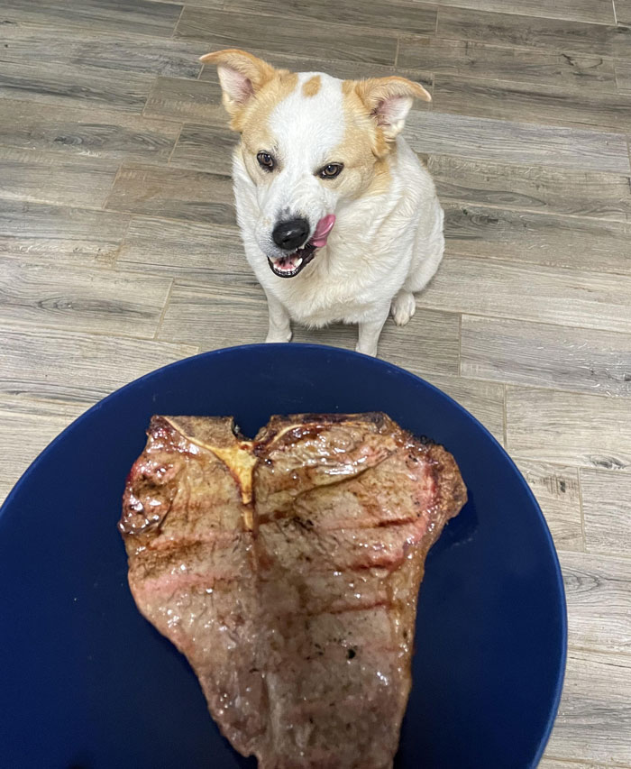 For their birthdays every year, all our dog’s split a steak. Xena was especially excited about her steak this year!