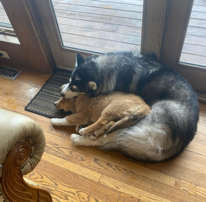 Cora took in a new pup like one of her own.