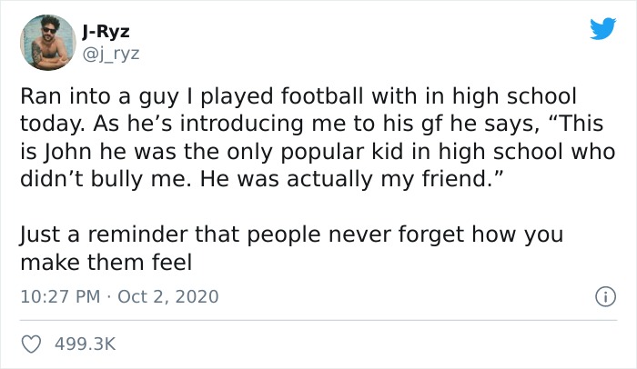 He concluded the tweet with “Just a reminder that people never forget how you make them feel.” And it’s true—things like these tend to stick with you for the rest of your life. There are people who have been bullied in school who still remember the names and faces of those who have wronged them.