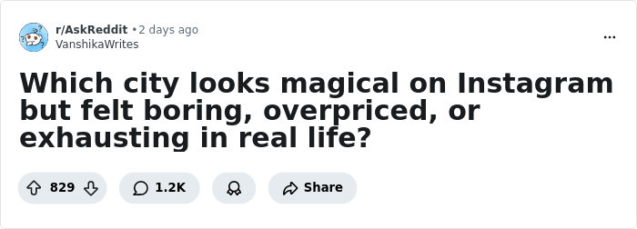 Someone asked “Which city looks magical on Instagram but felt boring, overpriced, or exhausting in real life?” and travelers share their thoughts with the internet. So get comfortable as you scroll through, upvote your favorites and be sure to add your own thoughts and experiences to the comments down below.