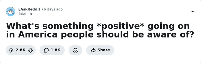 But just beyond the noise, there are thousands of smaller, quieter currents of progress and decency pushing things in the right direction. They don't always make the headlines, but they are just as real. An online community asked a powerful, refreshing question: What's something positive going on in America people should be aware of?