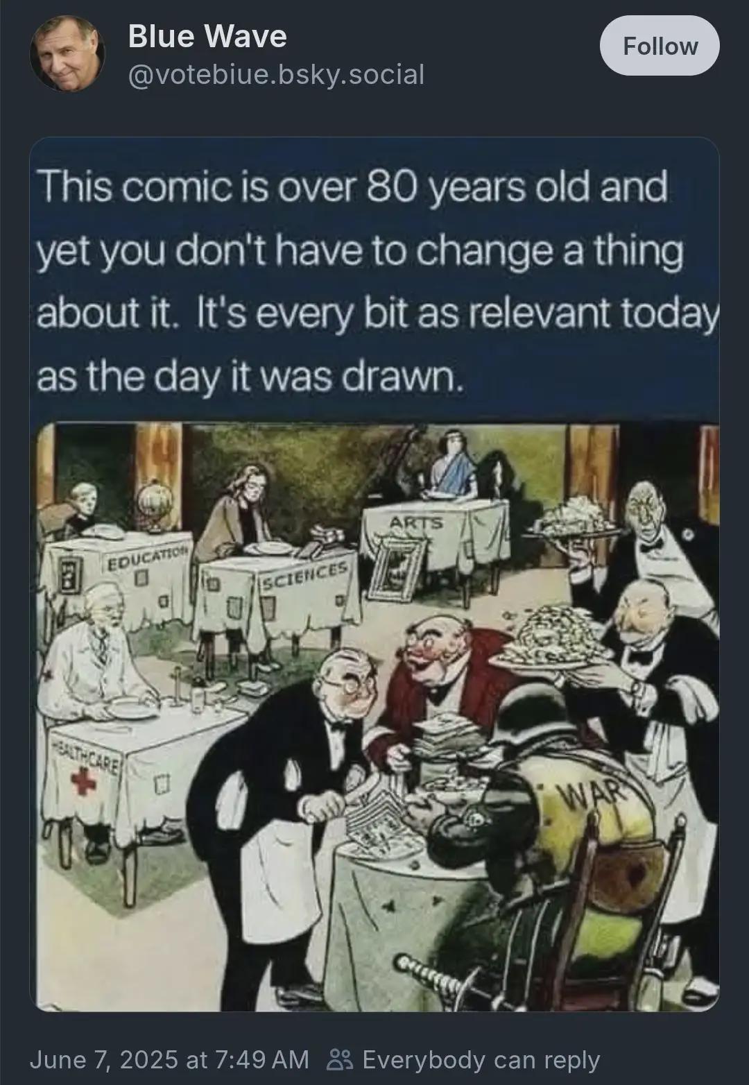 Funny thing is, that's a Soviet cartoon lampooning America (and the capitalist West generally). Consider: how much do you think Putin cares about arts, education, science, healthcare - compared to WAR!