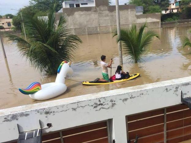 Two Kayakers Try To Beat The Current Pushing Them Down An Overflowing Brays Bayou From Tropical Storm Harvey In Houston