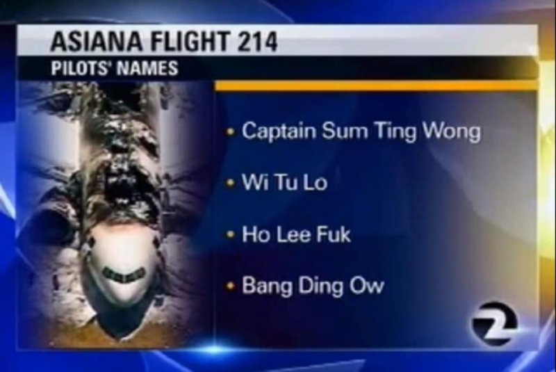 After Asiana Airlines flight 214 crashed in San Francisco, KTVU released the "names" of the crew. Captain Sum Ting Wong, Wi Tu Lo, Ho Lee F*k, and Bang Ding Ow. I'm guessing someone got fired after that incident.