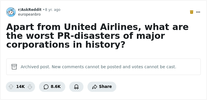 It's not unusual for big companies like Boeing to face PR nightmares. Some are so disastrous that they're still mentioned decades later. Someone once asked people to share what they believed were the worst PR disasters of major corporations in history. And there were thousands of responses. Bored Panda has put together a list of the craziest comments. Let us know which ones stand out for you by upvoting them. You'll also find more about Boeing's PR crisis between the screenshots.