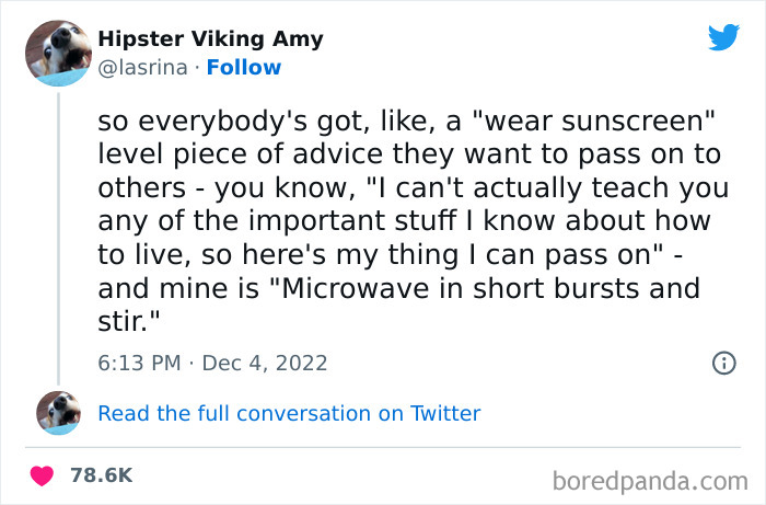 However, when Twitter user Hipster Viking Amy (@lasrina) dished hers, many did. "So everybody's got, like, a 'wear sunscreen' level piece of advice they want to pass on to others," she wrote. "You know, 'I can't actually teach you any of the important stuff I know about how to live, so here's my thing I can pass on' - and mine is 'Microwave in short bursts and stir.'"