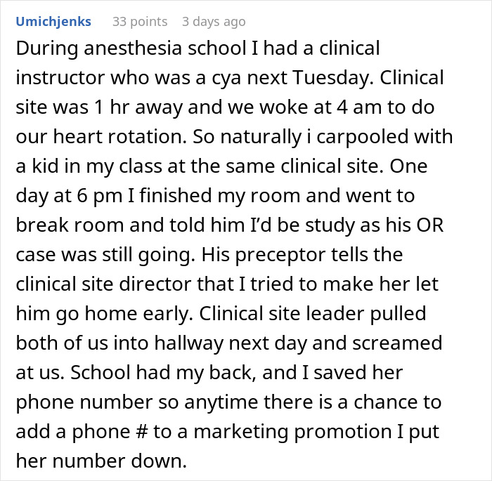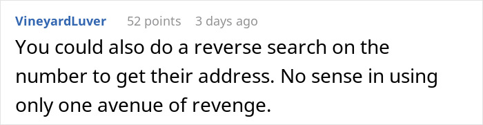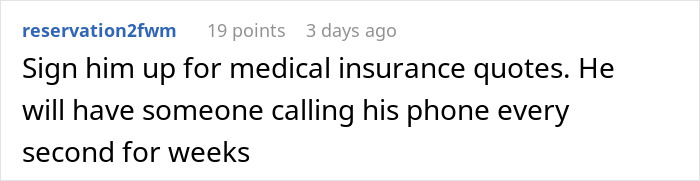 The OP gave the number for colleges, insurance, extended warranties. People in the comments suggested Jehovah’s witnesses, Scientology church and Craig’s list. The prankster should be getting all those annoying calls now and because all of the organizations have their number, this revenge may last for months. Feels very appropriate as they are receiving annoying calls for making one themselves.