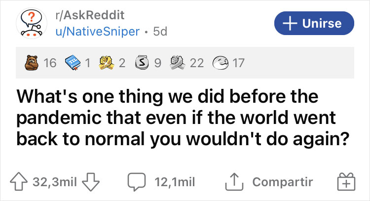So in order to find out what new post-pandemic values, habits and behavior we have all adopted, we took a look at this illuminating thread on r/AskReddit. “What's one thing we did before the pandemic that even if the world went back to normal you wouldn't do again?” asked u/NativeSniper, and below are the most interesting answers shared by people that really make you wonder. Aren’t we all just a tiny bit more conscious than we used to be?