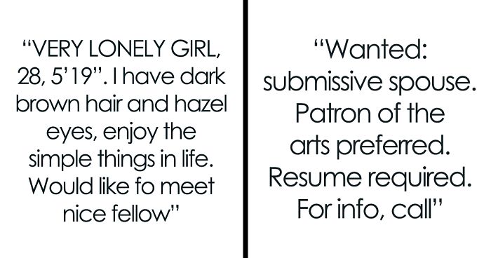 Also called lonely hearts ads, these short messages would often be quirky, romantic, and witty. But they could also be direct, morally questionable, and contain a whiff of casual sexism. Thanks to the Instagram page Long Lost Personals, today we get to see what folks from the '50s might've put in their Tinder bios if they had a chance.