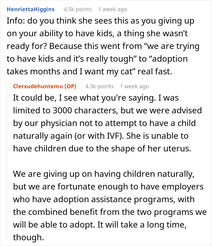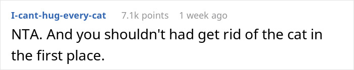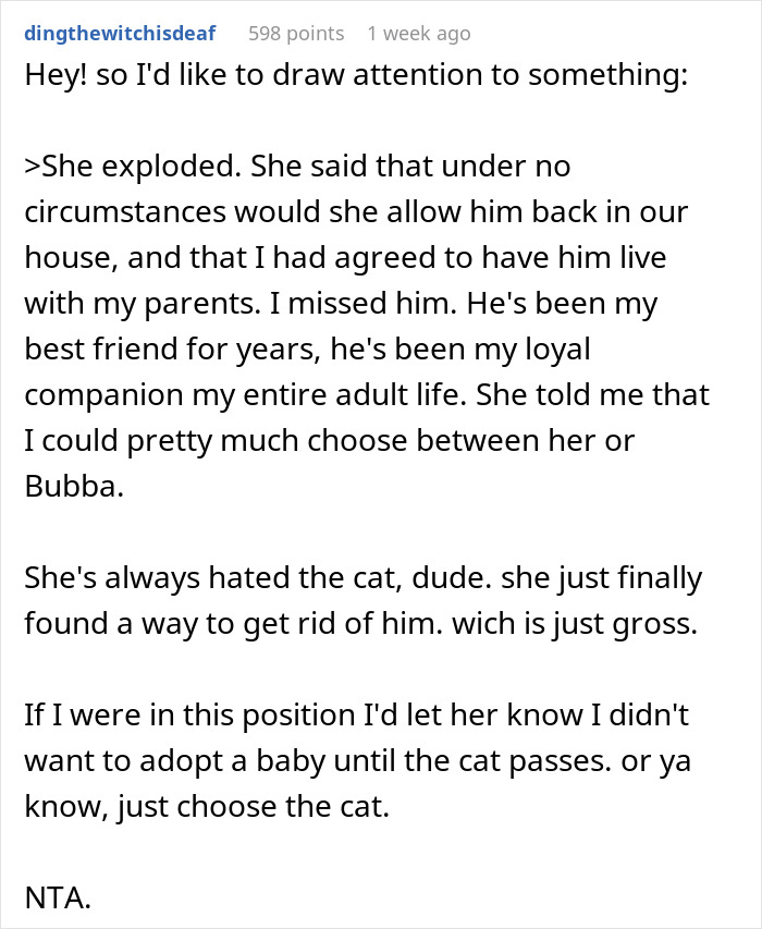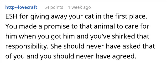The adoption process takes a long time. So, the redditor wanted to bring his pet back home during that period of time. “I missed him. He’s been my best friend for years, he’s been my loyal companion my entire adult life.” However, his wife was firmly set against this and they had an explosive argument. This prompted the OP to ask the AITA community for their advice. He wasn’t sure whether or not he was wrong to want his cat back home, even though he’d obviously choose his wife if he was ever forced to pick between the two of them.