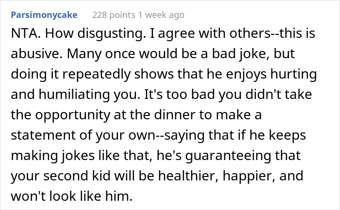 Putting each other down should never be tolerated in a balanced relationship, so it’s no surprise that many members of the AITA community were concerned for the woman. After all, hearing your husband repeat over and over again how he hopes your child will look “nothing like” you is extremely hurtful and far from the healthy and respectful behavior people hope to receive in marriage. The husband seems to go out of his way to erode the woman’s confidence in herself and then brush it off like it’s no big deal. This whole incident shows a hint of gaslighting, a kind of manipulation tactic by psychological means that leads people to question their reality, and it’s considered to be a big glaring red flag in any partnership.