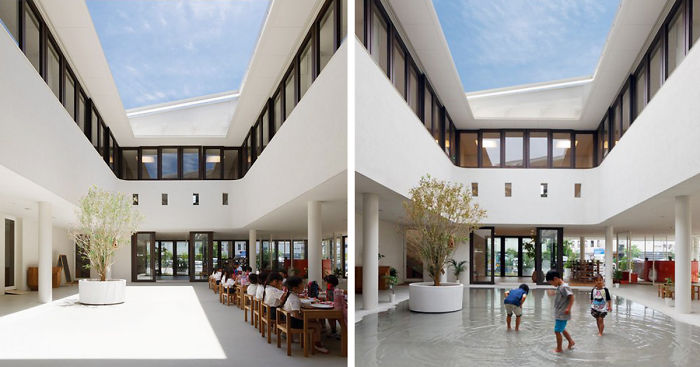 The Dai-Ichi Yochien preschool building in Kumamoto City in southern Japan has a special innovation that lets ‘kids be kids’ – a courtyard that collects rainwater into one giant, clean puddle that kids can stomp and splash through.