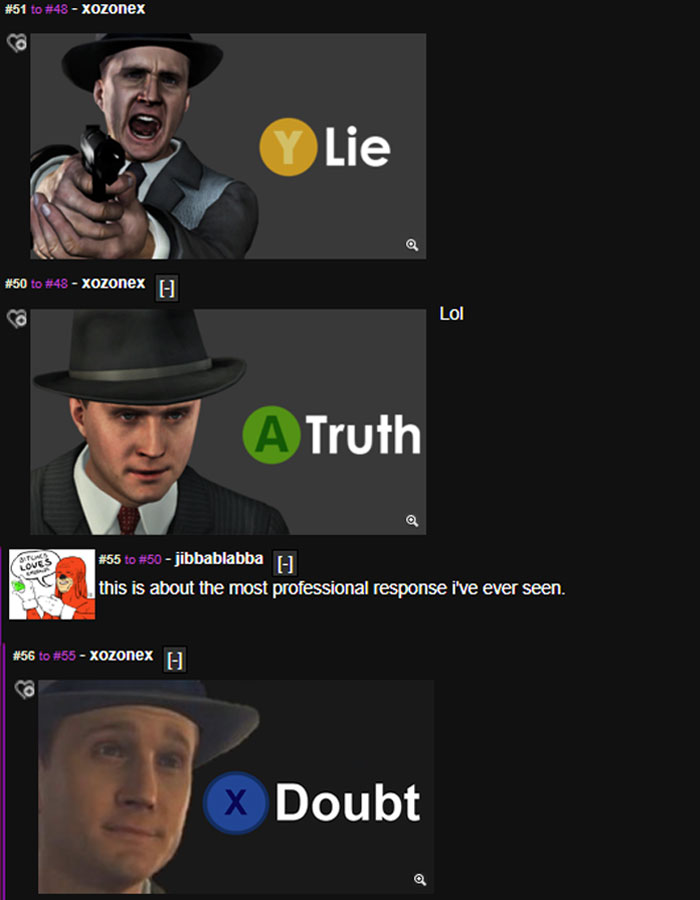 The “X to doubt” reaction image is derived from the L.A. Noire game. Memes with this catchphrase were used in social feeds and comments to express disbelief over the thread topic or the previous statement within a comment section.