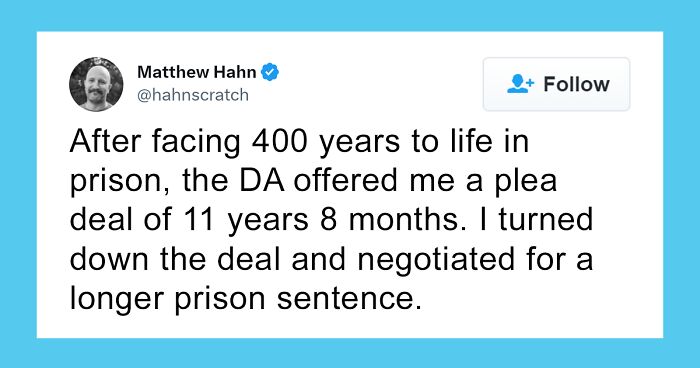 Matthew asked his lawyer to talk to the district attorney about possible terms, and they replied that the DA was not interested in the length of the sentence – as long as the OP served nine years in prison. Thus, if Hahn wanted to get his desired 50%, he had to agree to an initial sentence of at least eighteen years.