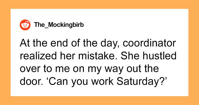 The OP shared with Bored Panda why she chose not to stay and help: “I was raised to be polite and helpful. I have gladly worked Saturdays when other coordinators asked. It’s a somewhat common occurrence, and again, I like being helpful. I wanted so badly to be liked and appreciated back then. Even now if I’m being completely honest. But [Coordinator] #2 helped me realize sometimes people are unreasonable and mean, and there’s nothing you can do to make them like you.