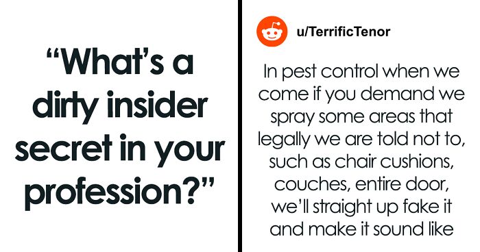 30 People Reveal “Dark Secrets” About Their Jobs That Common People Aren’t Supposed To Know In pest control when we come to spray your place if you demand we spray some areas that legally we are told not to, such as chair cushions, couches, entire doors for example, we’ll straight up fake it and through in some fancy chemical words to make it sound like we did. Sorry but not sorry, we’ll do the best we can cause we know pests can legit be a medical problem and we want nothing more than to help, but we don’t care if you say “just off the books lol” we’re not about to get fined or sued when you get a rash from a pesticide covered chair that you requested. (We don’t care if you don’t care about that, we do and that’s all there is to it)