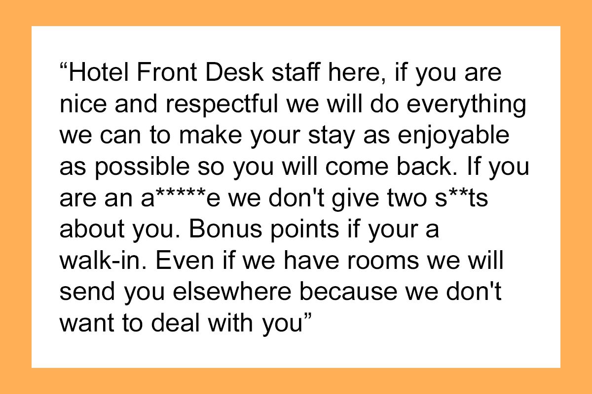 30 People Reveal “Dark Secrets” About Their Jobs That Common People Aren’t Supposed To Know Hotel Front Desk staff here, if you are nice and respectful we will do everything we can to make your stay as enjoyable as possible so you will come back. If you are an a*****e we don't give two s**ts about you. Bonus points if your a walk-in. Even if we have rooms we will send you elsewhere because we don't want to deal with you. Edit: I worded part of it poorly, I didn't mean walk ins as a bad thing. I meant people walking in and being an a*****e demanding and being deliberately rude and causing an issue.