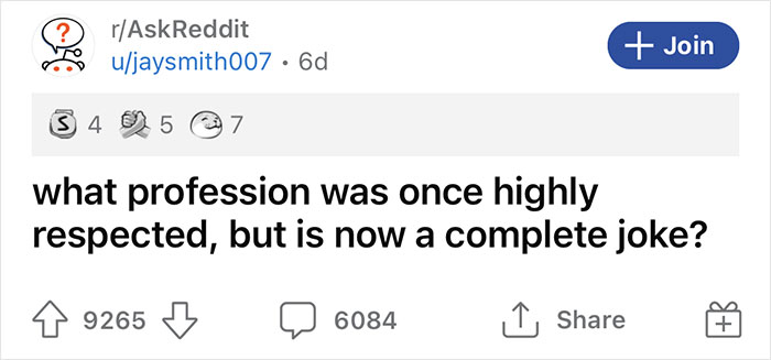 Interested in the changes of the labor market, Redditor u/jaysmith007 asked other platform users last week, "What profession was once highly respected, but is now a complete joke?"