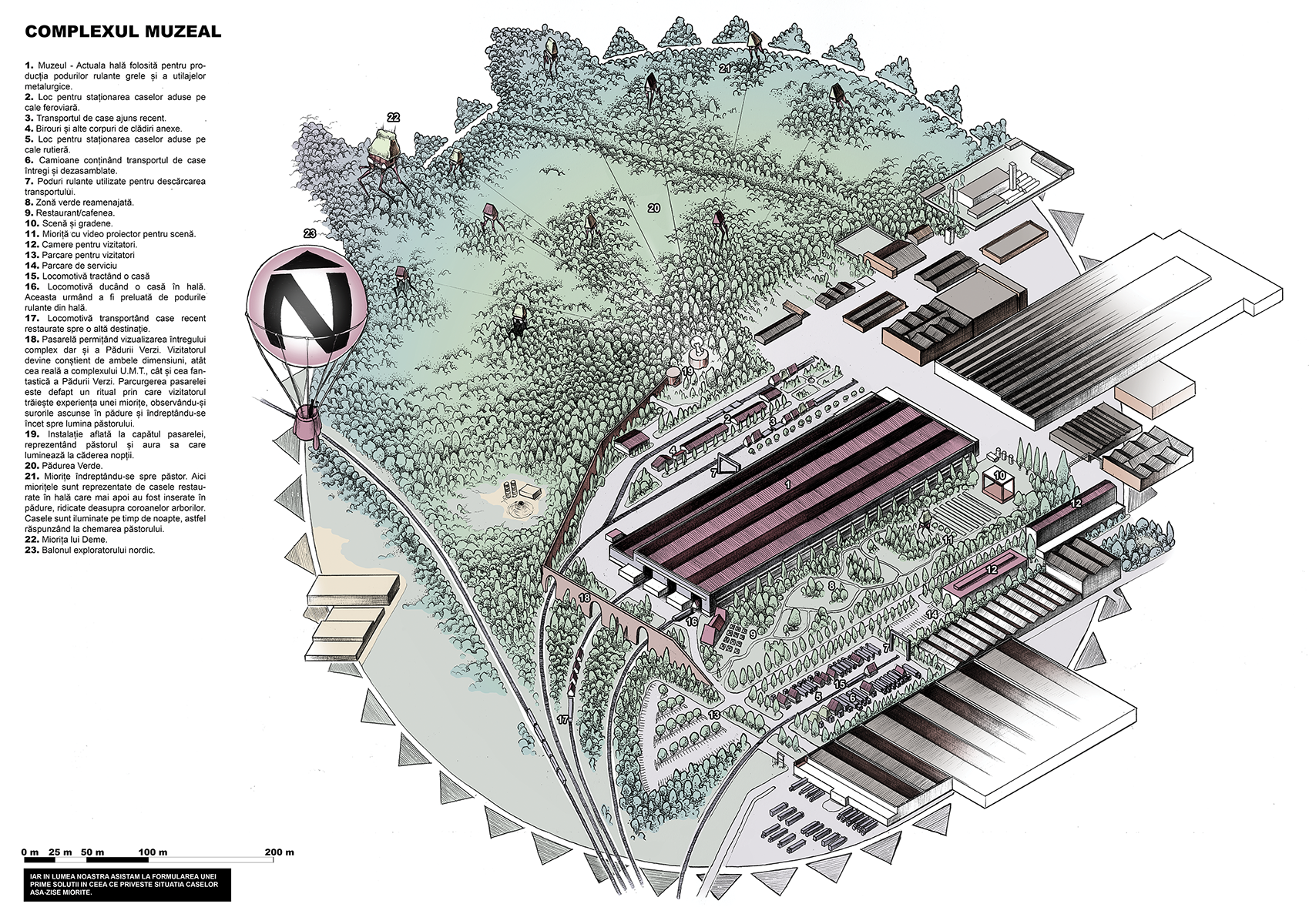 The project is about a new type of museum for Romanian ethnographic architecture (in this case traditional houses made out of wood). It is a continuation of a future comic book, now only found in a story-board stage.