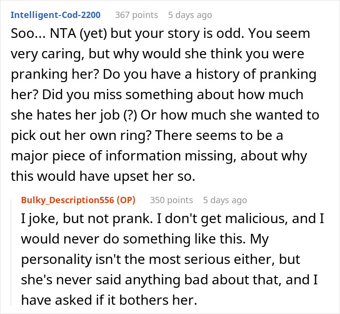 And so, one fine evening, when everything was ready, the author of the post proposed to his sweetheart. Everything happened in the park, in a secluded corner where no one saw the lovers. Of course, the girl said yes, but when she saw the ring on the chain, her reaction changed to the exact opposite. She got absolutely mad at him, stating that the OP apparently wanted to prank her and stormed off, not wanting to listen to any apologies or explanations.