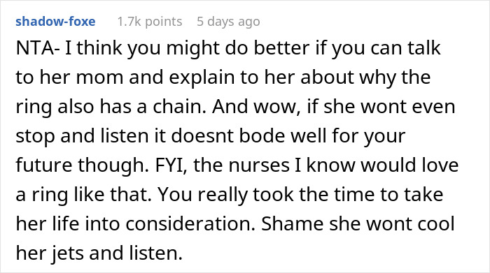 Moreover, in the comments, the original poster himself specifically noted that the design of the chain, of course, provided for a clasp, so that the necklace and the ring could be worn separately. And most folks in the comments are simply at a loss as to what made his sweetheart so angry. The OP also said that the girl’s brother has a habit of nasty pranks, so it’s likely that she already has some prejudice against what can be classified as a likely prank.