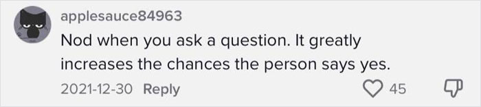Subtly nodding when someone is talking to you indicates to that person that you are genuinely interested in what they have to say and they're going to like you more.