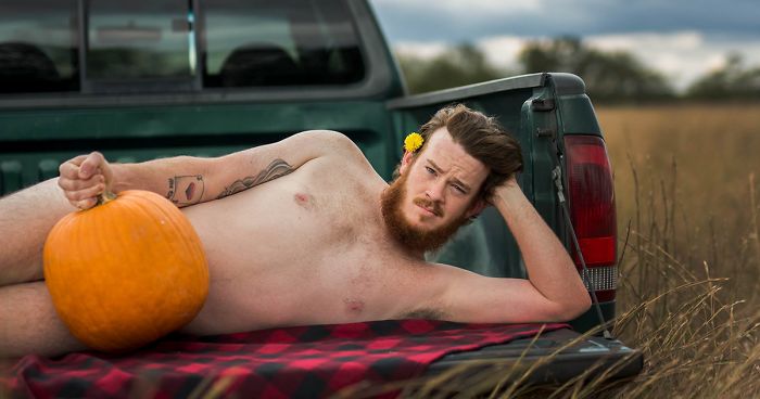 For most couples, the start of fall means taking corny photos at apple orchards, family cottages, and Starbucks cafes. Nashville-based photographer Gayla Thompson and her husband Ryan, however, decided to buck tradition and do something infinitely better – they held a ‘dudeoir’ photoshoot in the middle of a field, with Ryan wearing nothing but rolled-up boxer briefs and a series of strategically-placed pumpkins. Oh, and a bottle of Bud, of course.