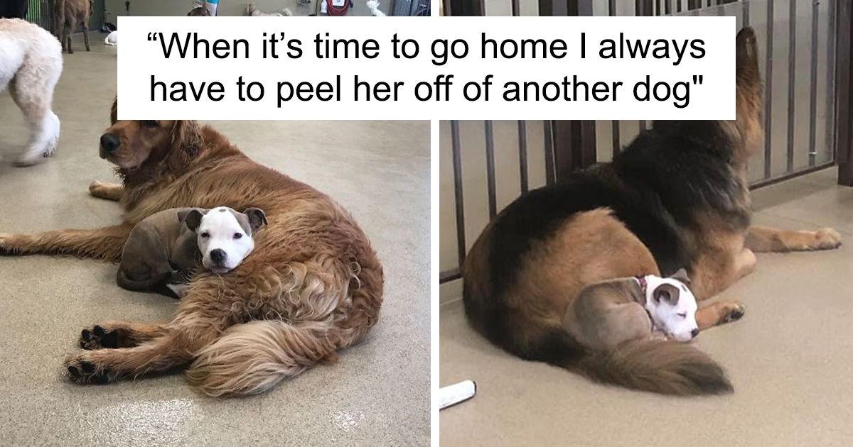 This doggo has been attending day care since she was just a little pup, and her routine has pretty much remained the same: Edna runs around, playing for the first couple of hours and exhausts herself so much, she needs to get some sleep to recharge her batteries. So, she starts looking around for a cozy spot to doze off for the remainder of the day. However, since so many dogs are competing for the same thing, finding it can be quite challenging. So Edna adapts. And when she needs a nap, she picks out a fluffy dog at day care and uses them as a pillow!