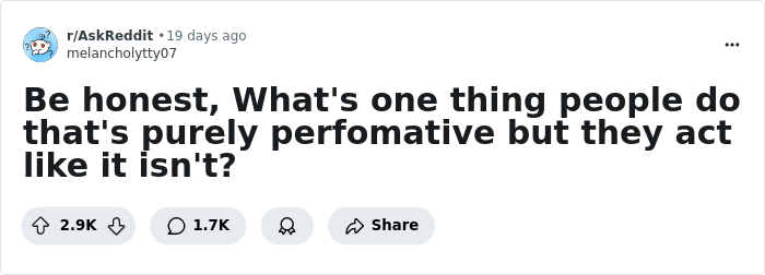 To learn more about how the phenomenon manifests, Reddit user Melancholytty07 asked everyone on the platform to share the things people do that are purely performative, even though many act like they aren't. The community's responses reveal just how ordinary these acts really are.