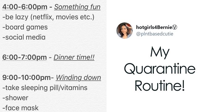 Her list of daily activities, titled Quarantine Routine, received over half a million likes and over 80k retweets. Even though @plntbasedcutie has a tougher time keeping herself occupied, since both her school and her work are shut down, she’s using the time to her own advantage. The list includes hobbies, self-care activities, chores, and, of course, fun things to do.