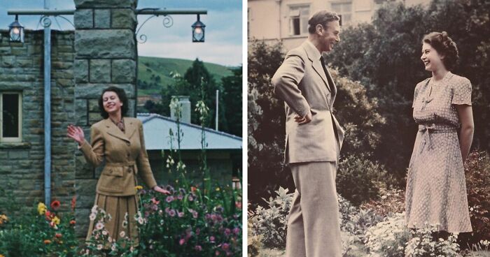 Here Elizabeth is visiting Balmoral, her family's vacation home. She's 20 years old and delighted with her new engagement ring, which was designed by Philip. This was a very low-stress time for her, because the public didn't know about the engagement yet.